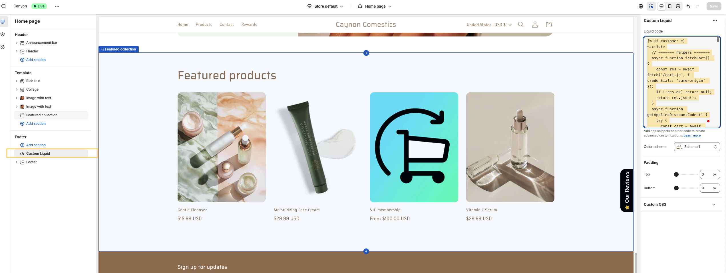 1. In the Theme Editor, add a **Custom liquid** block where you want the reminder to appear.